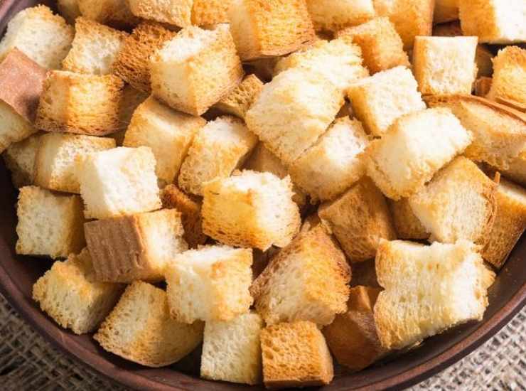 Poi aggiungi il pane tostato, basterà tagliarlo a dadini e lasciamo tostare in una padella ampia e antiaderente. Serviamo e gustiamo, ricorda di aggiungere delle foglie di basilico fresche.
