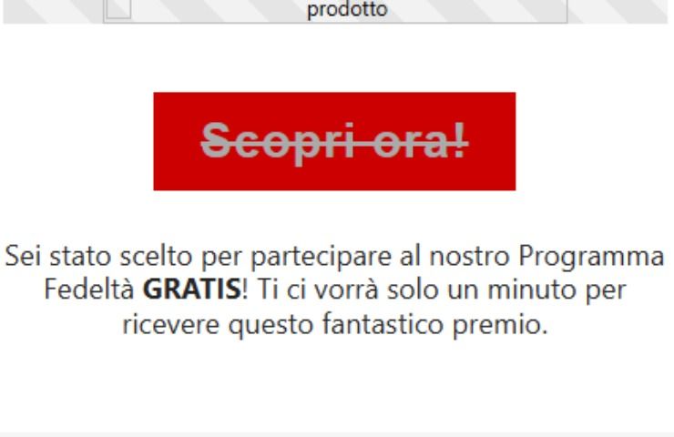 Ed ancora, c’è un grosso spazio in rosso su cui i malintenzionati vogliono che le vittime di questa truffa clicchino, con una grossa bugia posta subito al di sotto. Si fa infatti menzione ad un Programma Fedeltà GRATIS ed ancor una volta ad un “fantastico premio”. Della cui natura non si sa nulla.