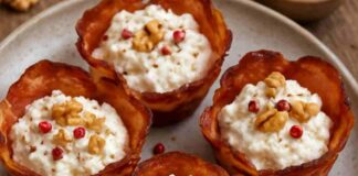 Cestini croccanti di pancetta con mousse di Ricotta, pepe rosa e...