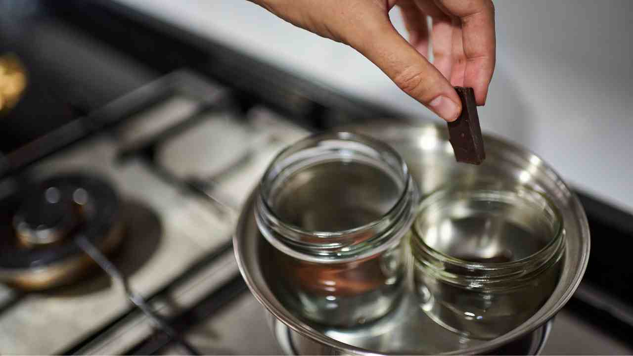 Si riempie la pentola inferiore con acqua e si porta a bollore. Poi si abbassa la fiamma al minimo. Si appoggia la ciotola sopra, assicurandosi che non tocchi l’acqua. Si spezza il cioccolato a pezzi piccoli e lo si mette nella ciotola. Si mescola di tanto in tanto con una spatola di silicone. Appena il cioccolato è sciolto e lucido, si toglie subito dal fuoco.