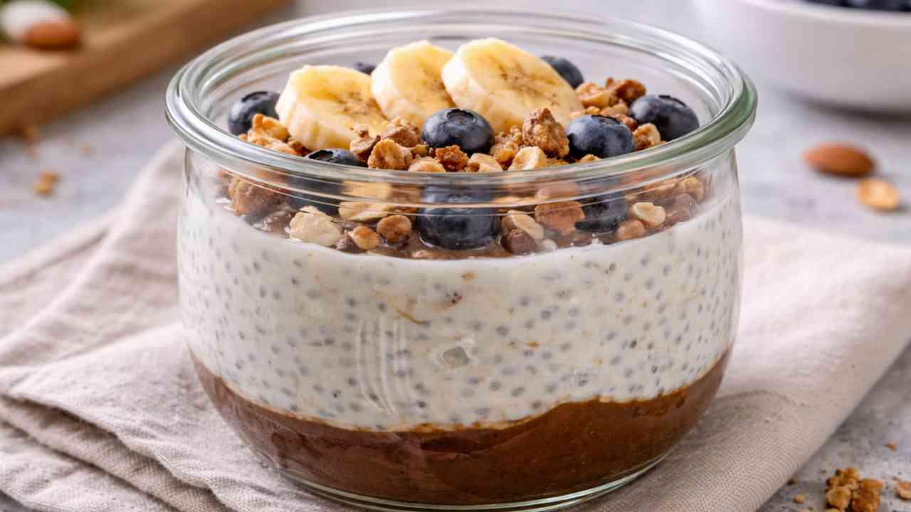 Il segreto di questo barattolino sta nell’equilibrio tra strati. La parte scura sotto dà “morso” e sembra quasi una base da cheesecake, mentre la crema sopra è leggera, saziante e con quella consistenza che si addensa da sola grazie alla chia. Non serve gelatina, non serve panna: basta il riposo, perché i semi assorbono liquidi e trasformano lo yogurt in un pudding compatto. È il genere di preparazione che ti salva quando vuoi qualcosa di dolce ma non pesante, e soprattutto quando vuoi la comodità del “pronto da prendere”.