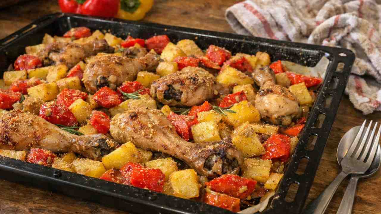 In questo piatto vince la composizione logica perché c’è tutto: proteine, fibre, cottura “asciutta”. Il pollo (meglio sovracosce disossate o petto) dà proteine sazianti; i peperoni portano volume, acqua e fibra, quindi riempiono il piatto senza pesare troppo. Il trucco è non affogare tutto nell’olio: basta una quantità misurata, perché in forno il grasso si distribuisce e “condisce” comunque. Un piatto che in media resta tra 350 e 450 kcal a porzione, a seconda del taglio scelto e di quanto olio usi. Gli ingredienti che ci serviranno, dunque, sono solo i seguenti: