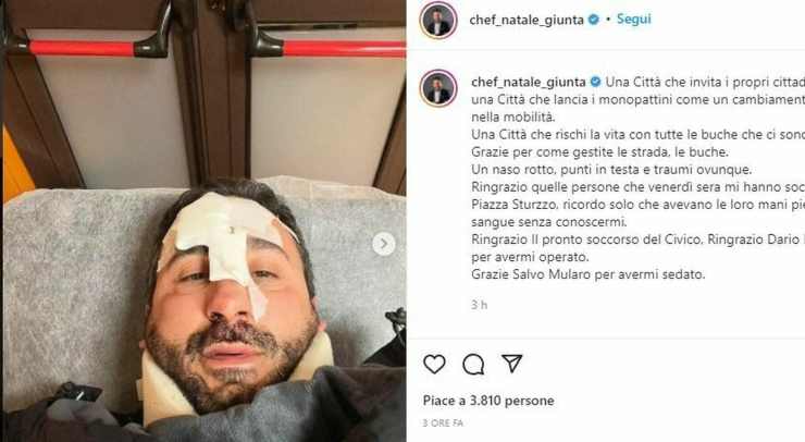 Natale non è solo un ottimo chef, ma anche un promotore di iniziative sociali per la valorizzazione delle bellezze, non solo gastronomiche, della sua terra. Di cui sa cogliere le meraviglie, ma anche evidenziare le criticità. Ed è proprio a causa di una grave negligenza che si è verificato il brutto incidente che lo ha visto suo malgrado protagonista. E’ lui stesso a fornire i dettagli dell’accaduto attraverso uno sfogo sui social, accompagnato da una foto in cui appare irriconoscibile.