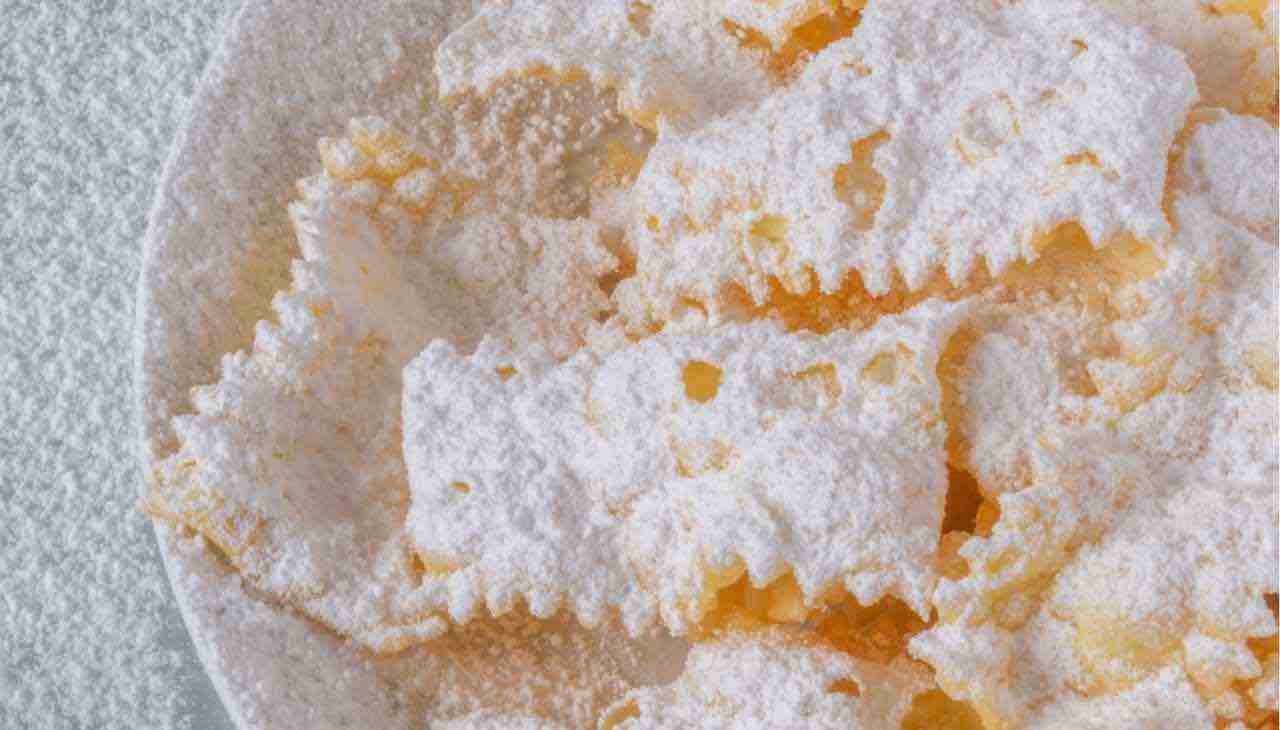Un errore comune è friggere troppe chiacchiere insieme o tenerle troppo a lungo nell’olio. In questo modo assorbono grasso e perdono leggerezza. La vera chiacchiera della nonna è asciutta, friabile e profumata, capace di sciogliersi in bocca senza lasciare sensazione di unto. Solo alla fine lo zucchero a velo completa il dolce, trasformando un impasto semplice in uno dei simboli più amati del Carnevale.