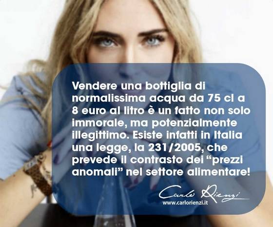 Precisando poi: “Vendere una bottiglia di normalissima acqua da 75 cl a 8 euro al litro è un fatto non solo immorale, ma potenzialmente illegittimo. Esiste infatti in Italia una legge, la 231 del 2005, che prevede il contrasto dei “prezzi anomali” nel settore alimentare, ossia quei prezzi soggetti a ricarichi eccessivi nei vari passaggi che li portano alla vendita al pubblico”