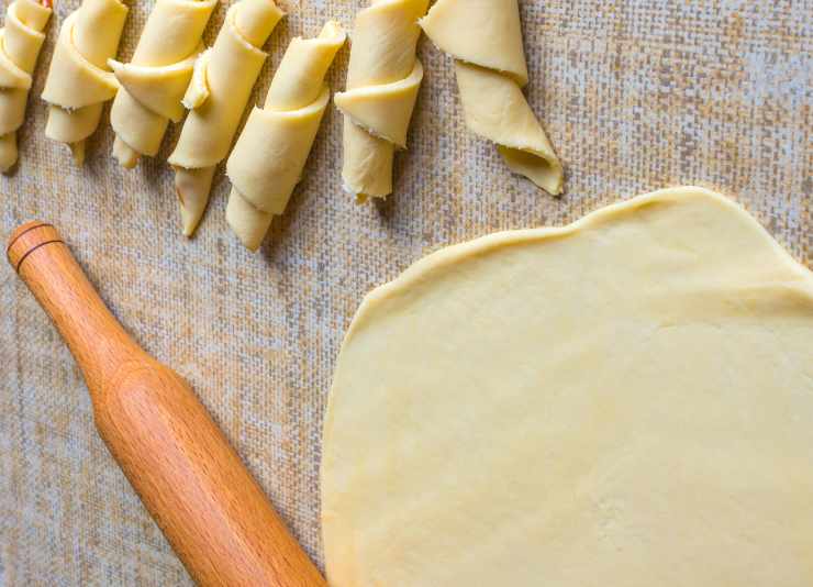 Una volta lievitato, trasferiamo l’impasto sul piano per lavorarlo. Creiamo dei rettangoli, che poi saranno tagliati in due triangoli e, prima di arrotolarli, farciamoli con la nutella.