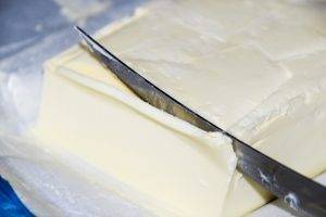Terminata la lievitazione, stendete la pasta su una spianatoia leggermente infarinata dandole la forma di un grande quadrato. Ponete al centro il panetto di burro, chiudete i lembi incorporando il panetto e schiacciate leggermente con il mattarello.