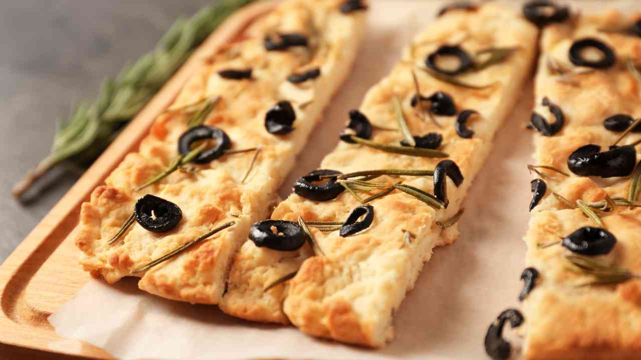 Per questa focaccia servono olive nere, quelle di Gaeta o di Taggiasca, che con il loro sapore intenso si sposano perfettamente con la morbidezza della pasta. Meglio se denocciolate, così non c’è il rischio di ritrovarsi con il nocciolo tra i denti.