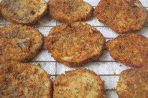 Ora, passate le melanzane prima nelle uova sbattute in precedenza e poi nella miscela di pangrattato. Scaldate abbastanza olio di semi in una padella anti aderente e cucinate le vostre melanzane impanate su entrambi i lati per qualche minuto fin quando non risulteranno dorate. Appena saranno pronte adagiate per qualche minuto su carta da cucina assorbente e servite.