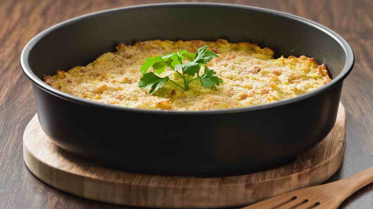 - Versa metà composto in una teglia oliata e cosparsa di pangrattato.