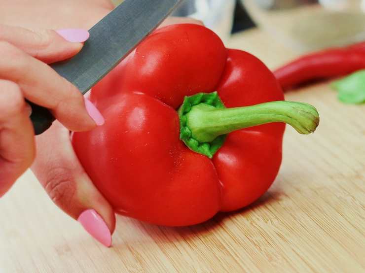Prendete ora i peperoni, puliteli eliminando il picciolo, i semini ed i filamenti interni e tagliate la polpa a pezzettini: aggiungetela al trito in casseruola e continuate a rosolare per 5 minuti ancora. A questo punto mettete sul fuoco una pentola con abbondante acqua salata per la pasta e portatela a bollore, poi sminuzzate i pomodori pelati ed aggiungeteli agli altri ingredienti in casseruola. Continuate a cuocere per 7/8 minuti a fuoco dolce, con il coperchio leggermente aperto in modo da fare uscire il vapore in eccesso. Giunta a bollore l’acqua per la pasta, versate il formato scelto ed al tempo stesso regolate di sale il sugo e togliete il coperchio in modo da far addensare ed insaporire.