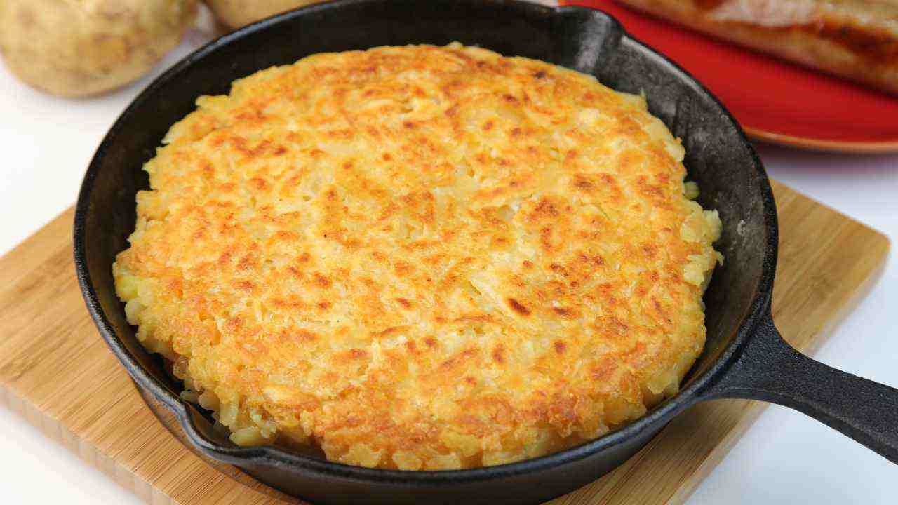 Facciamo sciogliere il burro all’interno di una padella ben riscaldata, poi inseriamo le patate grattugiate che abbiamo preparato in precedenza e facciamo cucinare donando la forma di una torta.