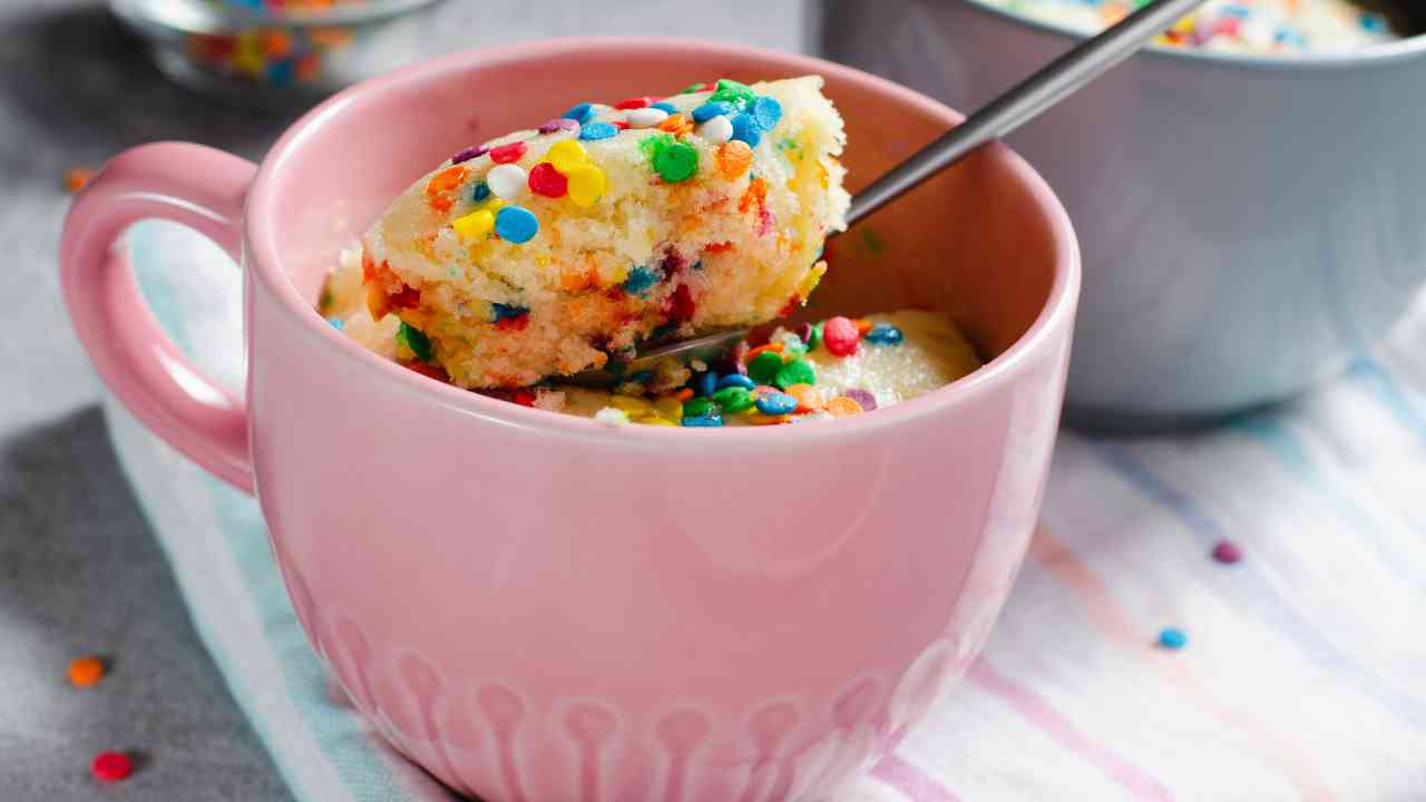 Ma se vuoi renderla davvero speciale, c’è una variante che mette subito allegria: la torta in tazza versione Arlecchino, con base bianca e confettini colorati nell’impasto. È la “mug cake” che sembra una festa, perfetta per una merenda con i bambini, per un dopocena improvvisato o semplicemente per regalarti un momento dolce e leggero… con il sorriso.
