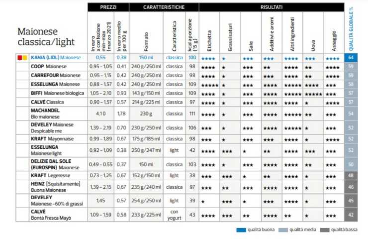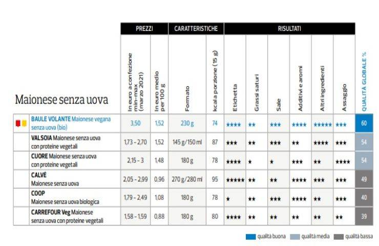 Al netto di tutto, il marchio migliore tra quelli classici è quello di Kania, che si trova in vendita da Lidl, secondo l’insindacabile giudizio degli esperti di Altroconsumo. Degne di menzione sono anche quelle con i marchi Coop, Carrefour, Esselunga, Biffi e Calvé classica. Nella tipologia senza uova spicca infine la maionese vegana di Baule volante.