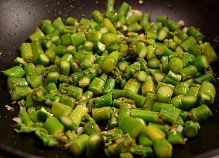 Successivamente passiamo agli asparagi. Togliamo loro le punte ed eliminiamo la parte finale più dura. Laviamoli accuratamente poi li facciamo soffriggere insieme ad olio e scalogno in una padella.