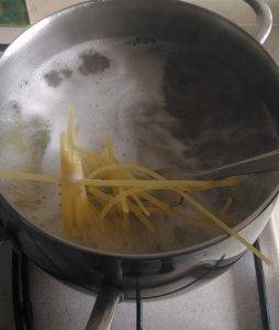 E’ il momento di preparare il sugo: prendete una pentola, versate abbondante olio extra vergine di oliva e fate soffriggere l’aglio. Quando sarà dorato, aggiungete i pomodori pelati, salate e coprite con un coperchio, facendo cuocere a fuoco dolce.