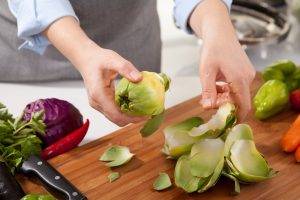 Pulire i carciofi eliminando le foglie esterne, quindi tagliarli a metà ed eliminare l’eventuale barbetta, infine tagliarli a fettine.
