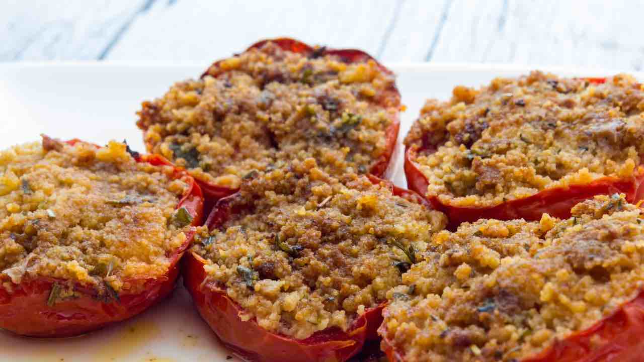 Perfetti per accompagnare secondi di carne, pesce o piatti vegetariani, i pomodori gratinati valorizzano al massimo la dolcezza naturale dell’ortaggio, esaltata da una panatura profumata alle erbe aromatiche.