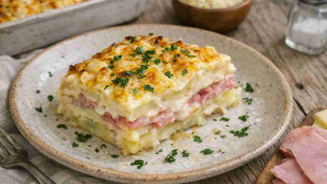 La magia sta nelle patate. Tagliate sottili come fossero sfoglie, si alternano a strati di besciamella, prosciutto e mozzarella, creando una lasagna vegetale che in forno diventa dorata, filante, irresistibile. È il piatto perfetto per chi vuole stupire senza passare ore ai fornelli, per chi cerca un’alternativa più leggera ma non vuole rinunciare al gusto. La prima volta che l’ho servita, a cena con amici, nessuno ha capito cosa stesse mangiando. Le patate, cotte lentamente, si amalgamano con il formaggio e prendono la consistenza di una pasta al dente. Il prosciutto aggiunge il sapore giusto, la besciamella lega il tutto. Il risultato è una lasagna che non ti aspetti.