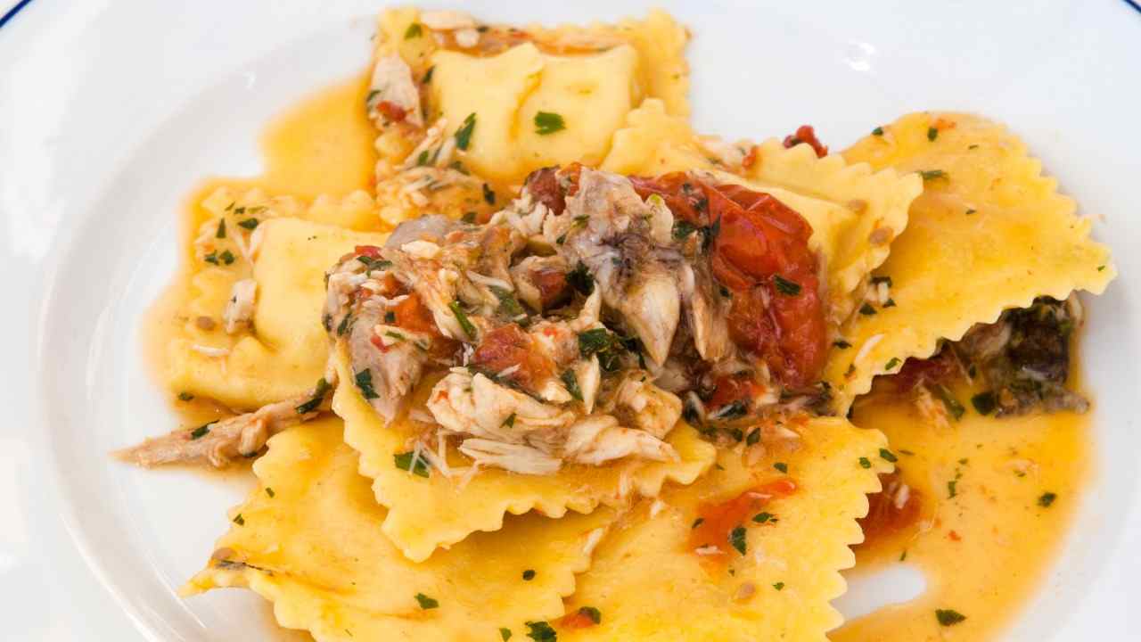 Adesso non resta che mettere in una padella antiaderente un poco di olio extra vergine di oliva ed uno spicchio di aglio intero, si unisce il baccalà tagliato a cubetti e si fa rosolare per bene. Dopo poco si elimina l’aglio e si sfuma con il vino bianco, si aggiunge la salsa di pomodori confit, ancora un poco di olio extra vergine di oliva, un po’ acqua di cottura della pasta, una parte di pinoli precedentemente tostati e una spolverata di prezzemolo fresco tritato. Contemporaneamente si saranno cotti anche i ravioli, si scola e si passano nella padella per farli insaporire.