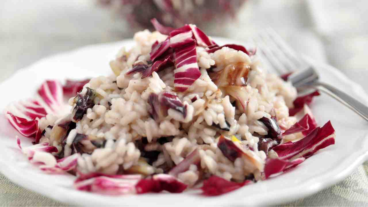 - Tritiamo la cipolla finemente, facciamola appassire dolcemente in due cucchiai di olio. Aggiungiamo il radicchio tagliato a listarelle e lasciamo che stufi qualche minuto, fino a che non sarà morbido e profumato. Versa il riso e tostalo bene finché non diventa traslucido e poi sfumalo con il vino bianco.