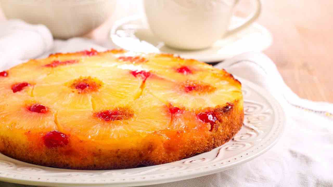 Scenografica, caramellata e dal sapore rétro: la torta all’ananas e ciliegie sciroppate è il dolce rovesciato che profuma di tradizione.