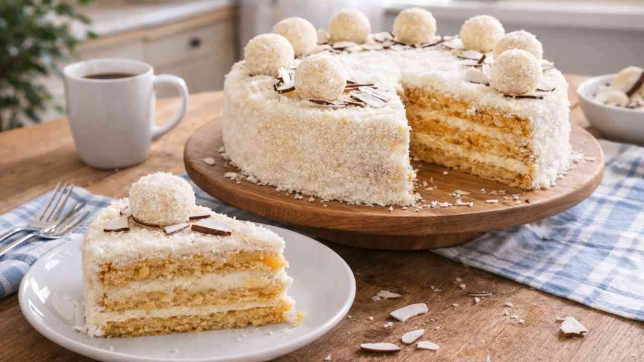 C’è un dolce che, appena lo porti in tavola, fa capire subito che non è “la solita torta”: bianca, profumata di cocco, con una crema morbida che sa di mandorla e vaniglia. La torta Raffaello è proprio questo: un maxi cioccolatino trasformato in dessert, ricco di gusto ma elegante, perfetto quando vuoi fare colpo senza complicarti la vita con mille strati.