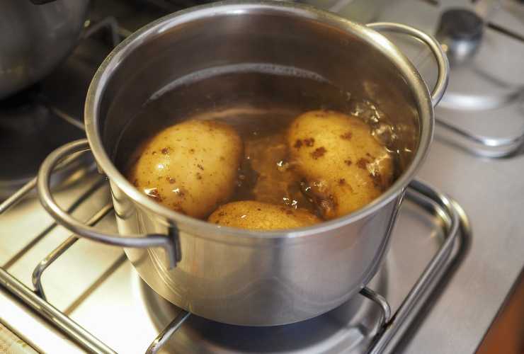 - Per preparare la nostra torta salata, dunque, la prima cosa che dobbiamo fare è prendere una pentola abbastanza capiente, dove mettere all’interno le patate ancora con la buccia e ricoprire con acqua fredda. Portiamo a bollore e facciamo cuocere per circa 20 minuti, in base alla grandezza, finché non saranno diventate perfettamente morbide e lessate. Tiriamole fuori dall’acqua, eliminiamo la buccia e tagliamole a fette spesse circa 1 cm.